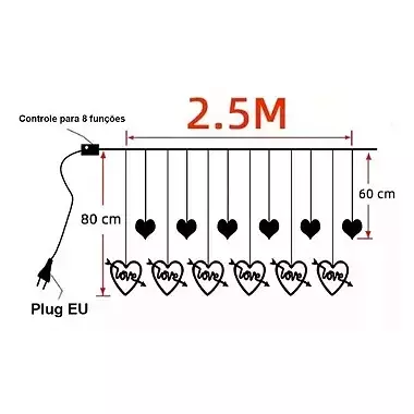A Cascata com 138 LEDs Branco quente com corações na ponta 8 funções tomada macho e fêmea 2,5 metros 127V, ideal para todo tipo de decoração; O produto mais utilizado por arquitetos e decoradores para decorar casas, fachadas, lojas, prédios residenciais e comercio de todo o Brasil.