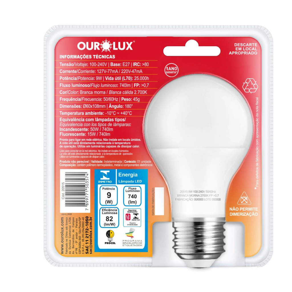 | Composição: | Lâmpada: polímero termoplástico, metal e componentes eletrônicos. |