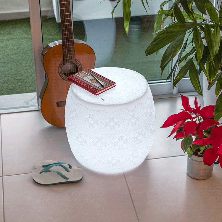 Inspirado na tradição açoriana da renda de bilro, este banco é todo trabalhado com padrões de renda. Lindíssimo, quando aceso a luz realça ainda mais os detalhes do desenho. Vem com sistema de LED colorido sem fio, podendo ser facilmente mudada de lugar e com controle remoto para escolher uma cor (ou deixar trocando).